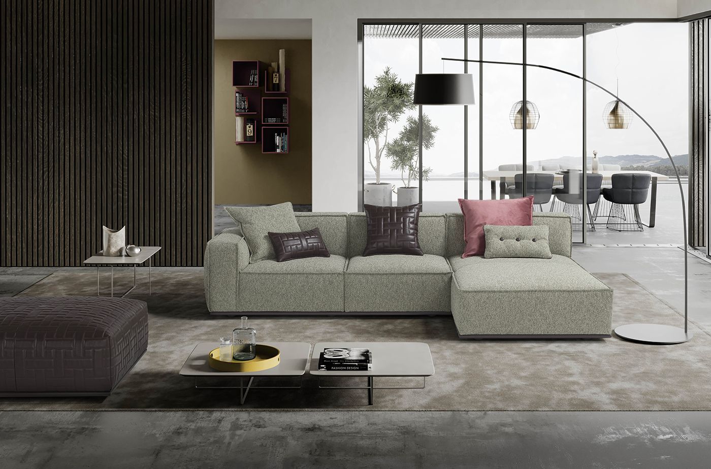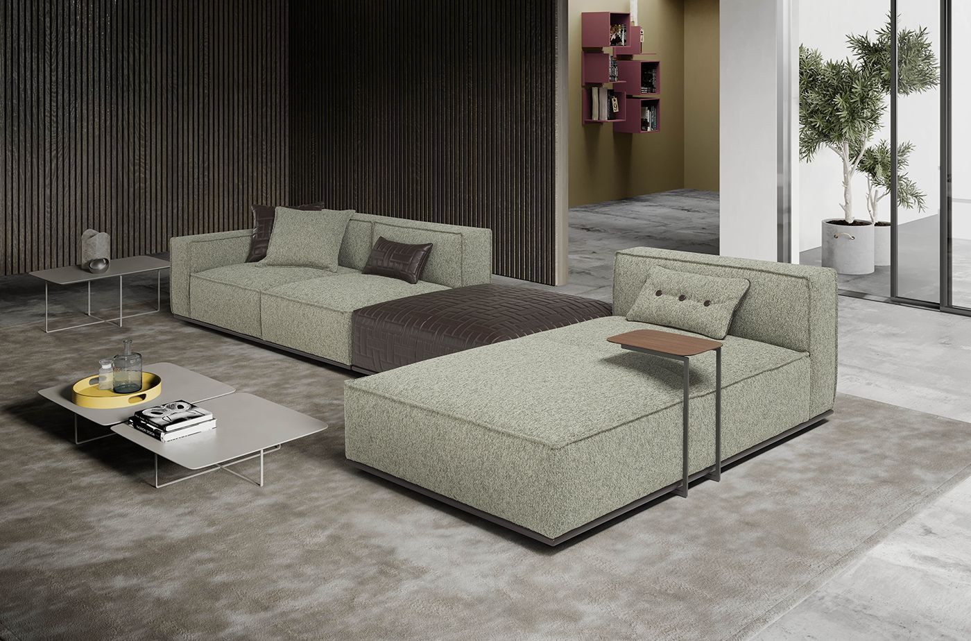 ALUM è il divano dal design contemporaneo che gioca con i volumi e la percezione della profondità alternando spazi vuoti e pieni.