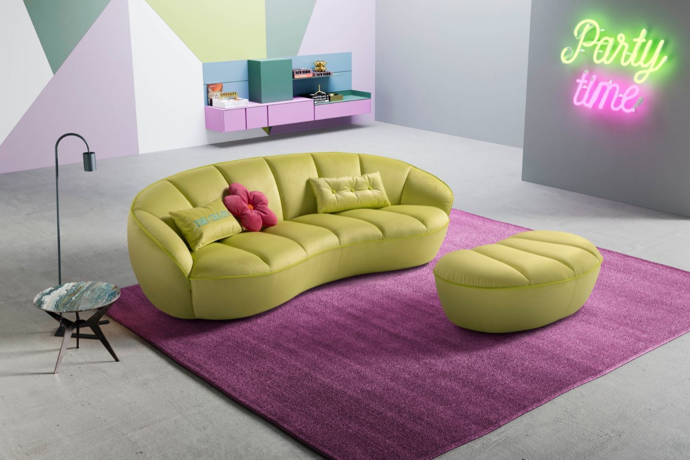 Giocate su una palette pop, spinta e irriverente, le forme ossimoriche di YUKI, morbide e spigolose allo stesso tempo, plasmano il living come uno spazio creativo che non ha paura di mostrarsi nella sua estrosità, originalità ed eccesso di colore. Chicca della collezione è la poltroncina con piedini alti a spillo rivestiti in lycra colorata.