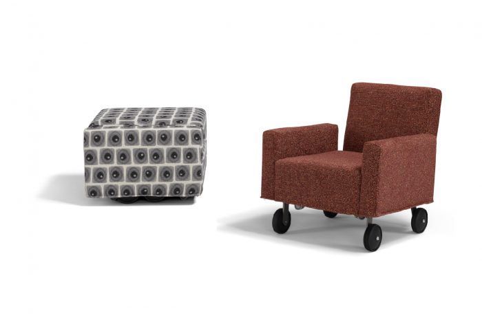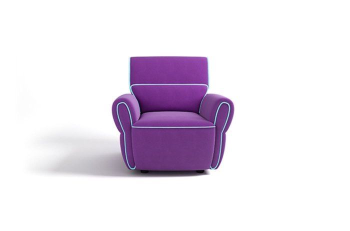 La poltroncina con schienale alto è l’elemento di punta della collezione grazie ai suoi piedini a spillo colorati rivestiti con il tessuto Boing e personalizzabili in tantissimi colori vivaci.